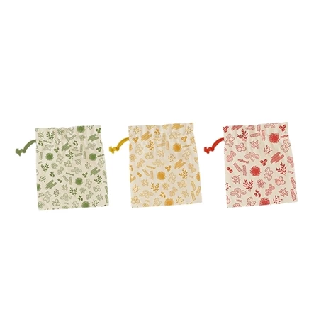 Les tailles des 3 sacs à vrac en coton bio sont identiques mais leurs coloris changent pour différencier leurs contenus. Munis d’un cordon de serrage pour les fermer facilement, ils remplacent les sacs plastiques ou les sacs en papier jetables, pour limiter les déchets dans la poubelle et pour des contenants durables. Jolis et pratiques, ces sacs prennent peu de place et sont plus pratiques que les contenants en verre de type bocaux.