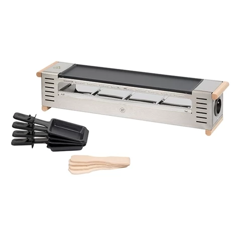 Développé par l’enseigne française Louis Tellier, l’appareil à raclette 4 poêlons Bron Coucke contient tout le savoir-faire unique de la marque labellisée patrimoine vivant. Fabriqué dans les ateliers savoyards, il est conçu pour satisfaire les besoins des plus fondus de fromage avec des matériaux de haute qualité : structure en acier inoxydable et revêtement antiadhérent grande épaisseur pour la plaque type plancha située sur le dessus, profitez des performances de chauffe les plus performantes. Avec ses deux poignées en bois de hêtre et ses lignes élancées, la dimension esthétique n’a pas non plus été négligée et votre table s’en retrouvera embellie.