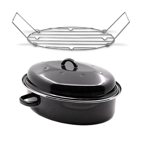 Le roaster noir moucheté et son couvercle sont en acier émaillé avec revêtement émail. Léger et avec ses poignées latérales faciles à saisir, ce roaster est pratique et passe facilement du four à la table.