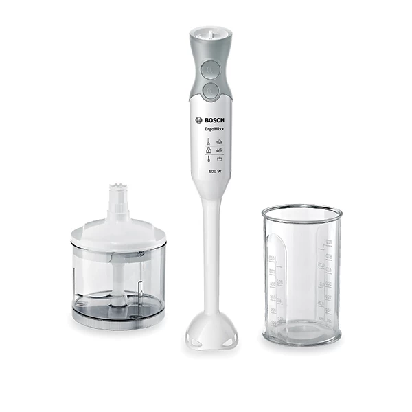 Le mixeur plongeant ErgoMixx gris et blanc 600 W BOSCH gris et blanc, facilite la réalisation des repas au quotidien comme en de multiples occasions.Son pied en plastique muni de 4 lames aiguisées permet d’obtenir rapidement des préparations onctueuses et homogènes, mais aussi de mixer les aliments de types fibreux.