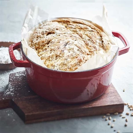 Ce format rond de 24 cm de diamètre est idéal pour des repas en petit comité. Utilisable pour confectionner votre pain, cette cocotte de 24 cm vous délivre un pain gonflé à la croûte dorée simple à réaliser.