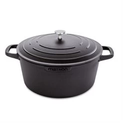 La cocotte légère en fonte d’aluminium ronde 28 cm noire Mathon de 6,7 L mêle tradition et modernité. Comme les cocottes en fonte de fer, elle est idéale pour mijoter vos plats ou pour la cuisson de vos rôtis et volailles. Elle est cependant 3 fois plus légère que ces dernières grâce à sa conception en fonte d’aluminium.