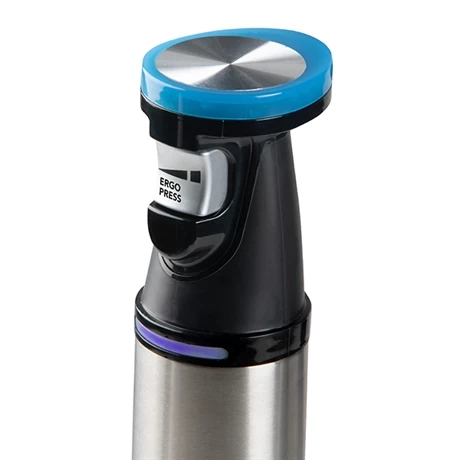 Conçu en inox haut de gamme, le mixeur s’éclaire en bleu pendant son utilisation et le bouton Ergo Press vous permet de contrôler la vitesse en fonction de l’intensité de pression effectuée avec votre doigt. Plus vous appuyez sur le bouton, plus la vitesse augmente ; le mixeur est ainsi réglable en continu et vous permet d’adapter l’intensité à la consistance souhaitée.
