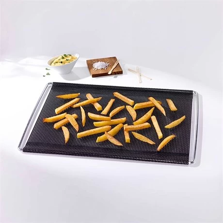 Perforée, la feuille de cuisson anti-adhérente apporte tous les avantages nécessaires à la cuisson ou au réchauffage des feuilletés ou pâtisseries qui bénéficieront d’une cuisson homogène permettant une cuisson croustillante et dorée à l »extérieur et moelleuse à l’intérieur !