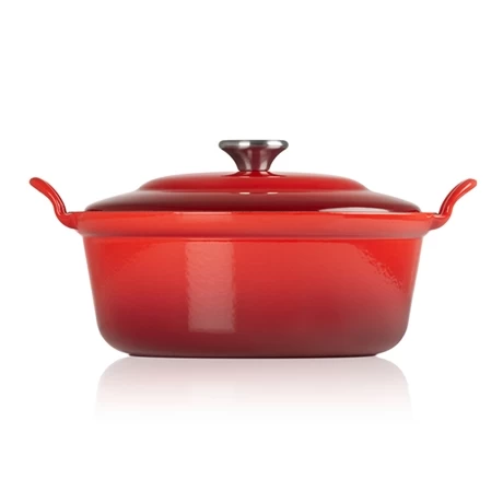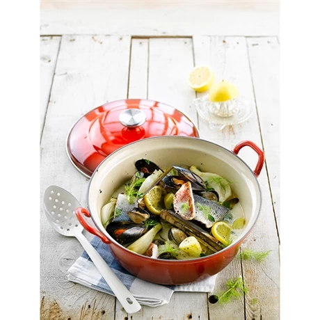 Très esthétique, ce faitout rouge brillant émaillé en fonte passe facilement de la cuisine à la table. Compatible tous feux dont induction, il est très polyvalent et passe même au four, au gril ou encore au barbecue.