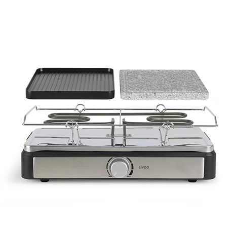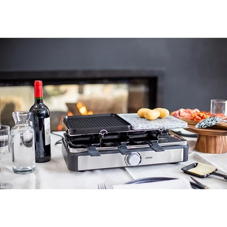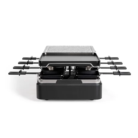 Créez une ambiance vacances aux sports d’hiver avec cet appareil à raclette 8 personnes 1400 W muni de 8 caquelons et 8 spatules bois. Bien stable grâce à ses pieds antidérapants, cet appareil est idéal pour une soirée décontractée entre amis et très pratique grâce à ses deux plateaux de 23 cm x 21 cm en pierre fonte d’aluminium antiadhésive.