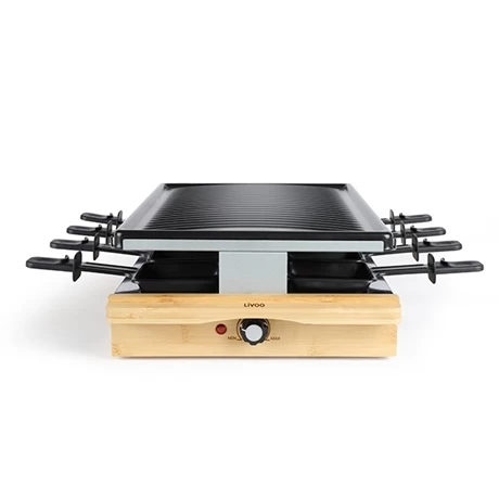 A vous les soirées conviviales avec cet appareil à raclette 8 personnes 1200 W DOC257 Livoo. D’un design élégant avec sa finition bambou, il dispose de 8 spatules en bois, 8 caquelons simples et 4 caquelons doubles pour se régaler plus vite. Pratique, un niveau supplémentaire accueille les caquelons vides pour ne pas encombrer la table. Sa plaque de cuisson permet de faire chauffer ou de garder au chaud viandes et légumes. Elle est antiadhésive et amovible pour un nettoyage facilité.