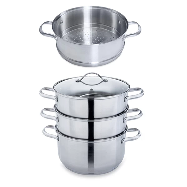 Faitout et paniers vapeur en inox brossé 18/8, résistant et facile d’entretien.