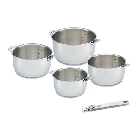 Le lot de 4 casseroles Select et sa poignée amovible fait partie de la nouvelle gamme de cuisson de Beka en acier inoxydable. Le set est composé de 4 casseroles de 14, 16, 18 et 20 cm de diamètre et d’une poignée amovible en inox et bakélite. Les casseroles possèdent un marquage intérieur des capacités pour une lecture simple et pratique des quantités. Très solide, l’acier a une durée de vie presque illimitée. Le set de 4 casseroles Select est compatible tous feux dont induction et au four. Nettoyage facile au lave-vaisselle.