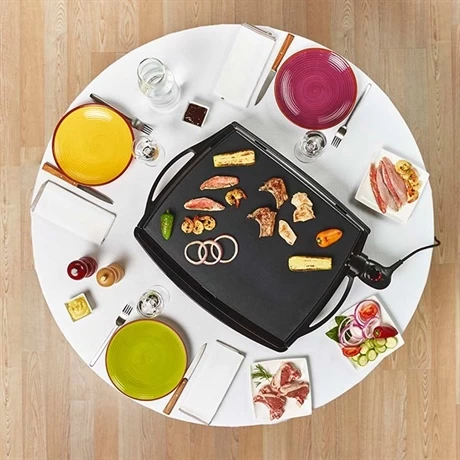 La plancha électrique est idéale pour cuire et griller des gambas, des pièces de viandes, des saucisses, du poisson… Elle assurera tous vos moments conviviaux ! La grande plaque antiadhésive de 44 cm vous permet de faire des grillades pour 8 à 10 personnes en 1 fois. La résistance est intégrée à la plaque pour une montée en température rapide. Vous réglerez le thermostat selon 5 niveaux dont maintien au chaud. La chaleur sera uniformément répartie pour des cuissons saines, dans le respect de vos aliments. Les pieds sont ajustables afin de pouvoir incliner la plaque et récupérer le jus, dans le bac récupérateur.
