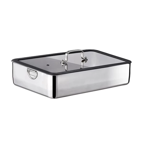 Fabriqué en acier inoxydable 18/10, le plat est résistant et assure des performances de cuisson excellentes pour toutes vos préparations de plats au quotidien. Pratique, son couvercle transparent avec les bords en silicone s’emboîte parfaitement et vous permet de surveiller la cuisson de vos plats facilement. La poignée est résistante à la chaleur pour une manipulation facile.