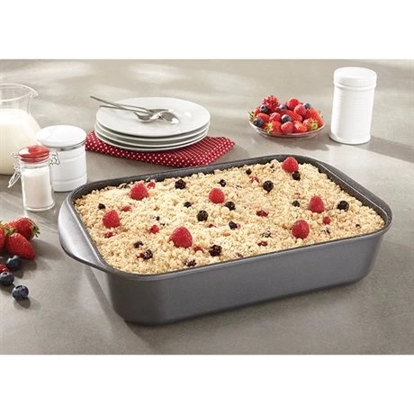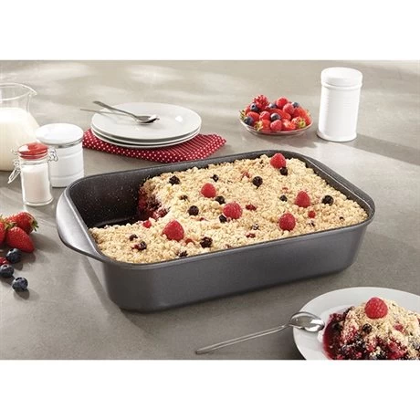 La forme rectangulaire du Plat à four Dur comme la Pierre permet de préparer toutes vos recettes sucrées ou salées à partager : gratins, lasagnes, crumbles ou encore brownies. En fonte d’aluminium, la cuisson se fait de manière homogène pour des préparations croustillantes et dorées à l’extérieur et tendres à l’intérieur. Son revêtement « dur comme la pierre » garanti sans PFOA permet de démouler vos préparations facilement avant de les couper et servir sans qu’elles n’attachent au fond.