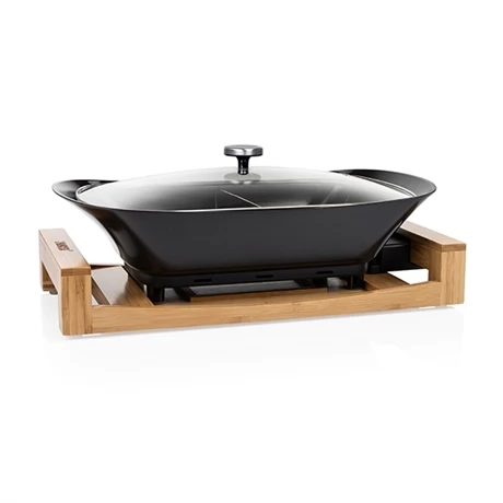 Esthétique, le multi-cuiseur et déposé sur un plateau en bambou et peut être branché directement à table .