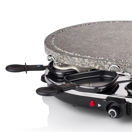 L’appareil à raclette de 1200 W est 2 en 1, il est équipé de 8 poêlons pour faire fondre votre fromage et d’une pierre à cuire ovale pour vos pierrades et grillades. La plaque de cuisson de 43 x 30 cm est amovible. Les 8 poêlons ont un revêtement antiadhésif et le thermostat est réglable jusqu’à 210°C.