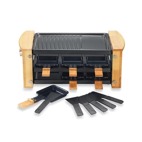 L’appareil à raclette 6 poêlons 900 W dispose d’un corps en bois véritable pour des moments conviviaux à 6 ! Compacte, cette raclette comporte une plaque antiadhésive permettant de faire griller vos accompagnements préférés. Complet, 6 poêlons antiadhésifs ainsi que 6 spatules vous permettent de faire fondre vos fromages favoris. Profitez également d’une raclette pratique grâce au range-poêlons ajouté en partie basse. Design, les poêlons disposent de manches en bois moderne.