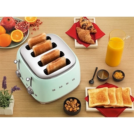 Ajoutez une touche vintage dans votre cuisine avec le toaster 4 fentes 2000 W TSF03PGEU vert d’eau SMEG : finitions chromées, touches et manette rétro-éclairées, formes arrondies et coloris rétro, ce grille-pain a été conçu pour vous plonger dans l’ambiance des années 50. Inclus dans une gamme faite en hommage à cette période, le toaster vintage SMEG est le fruit du travail de deux designers italiens renommés, Matteo Bazzicalupo et Raffaella Mangiarotti et de leur studio milanais.